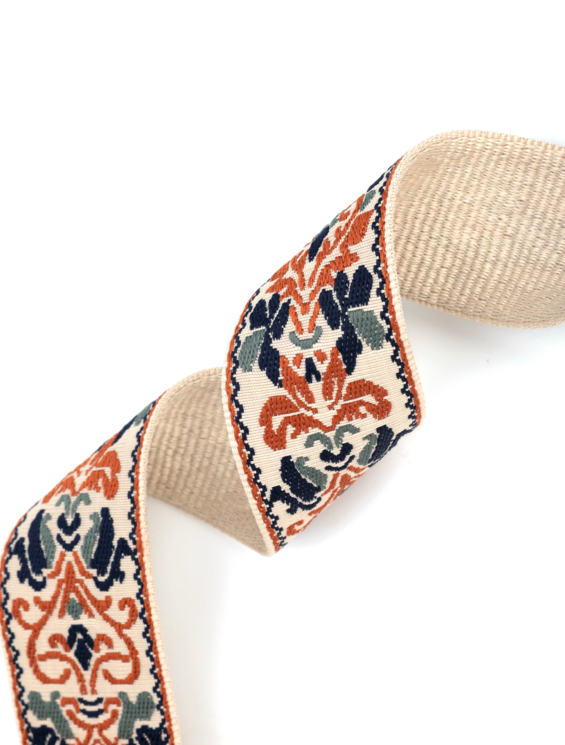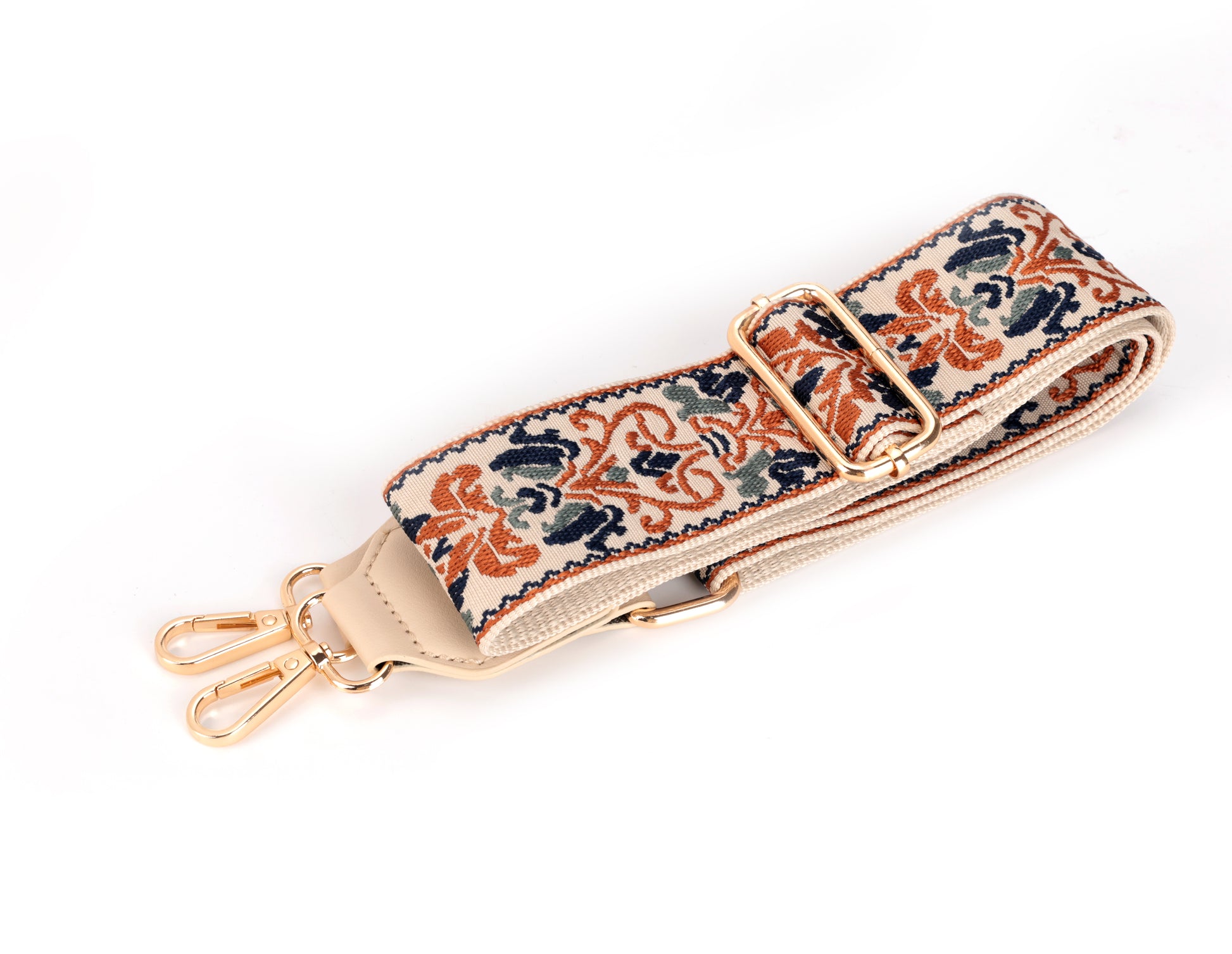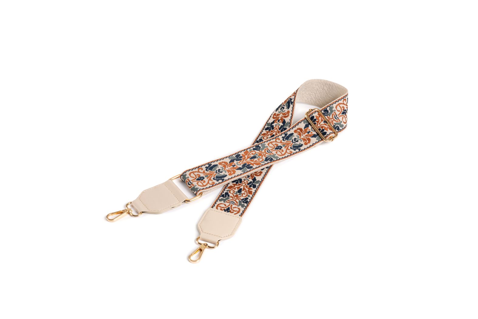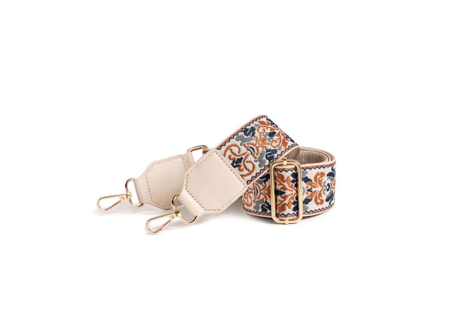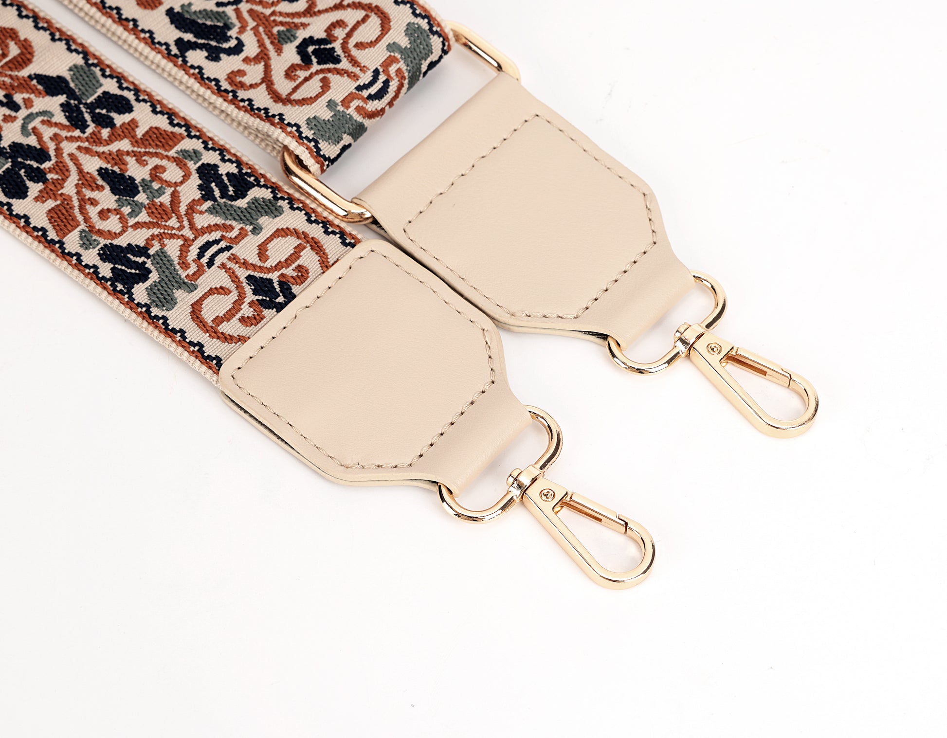 The Amber Weave Strap is a celebration of artisanal embroidery, blending earthy terracotta, navy, and cream threads into an intricate pattern that feels both timeless and modern. Its detailed embroidered design adds a touch of handcrafted elegance to any handbag, while beige leather ends and polished gold hardware ensure durability and style. Adjustable for shoulder or crossbody wear, it brings both practicality and a statement finish to your everyday looks.