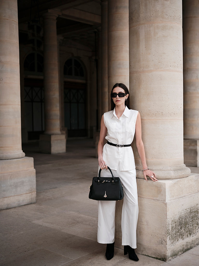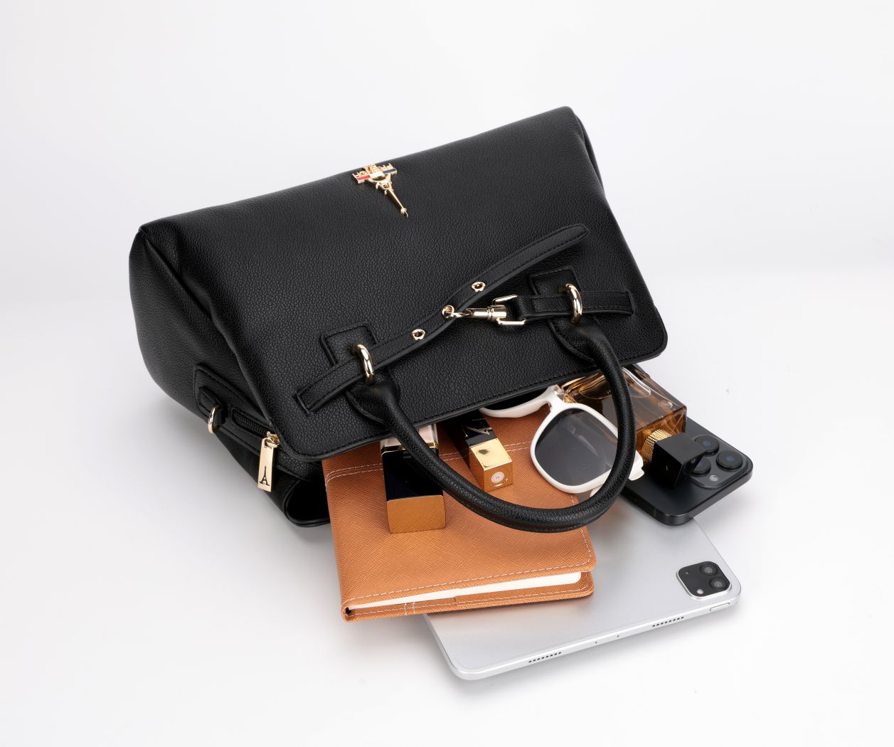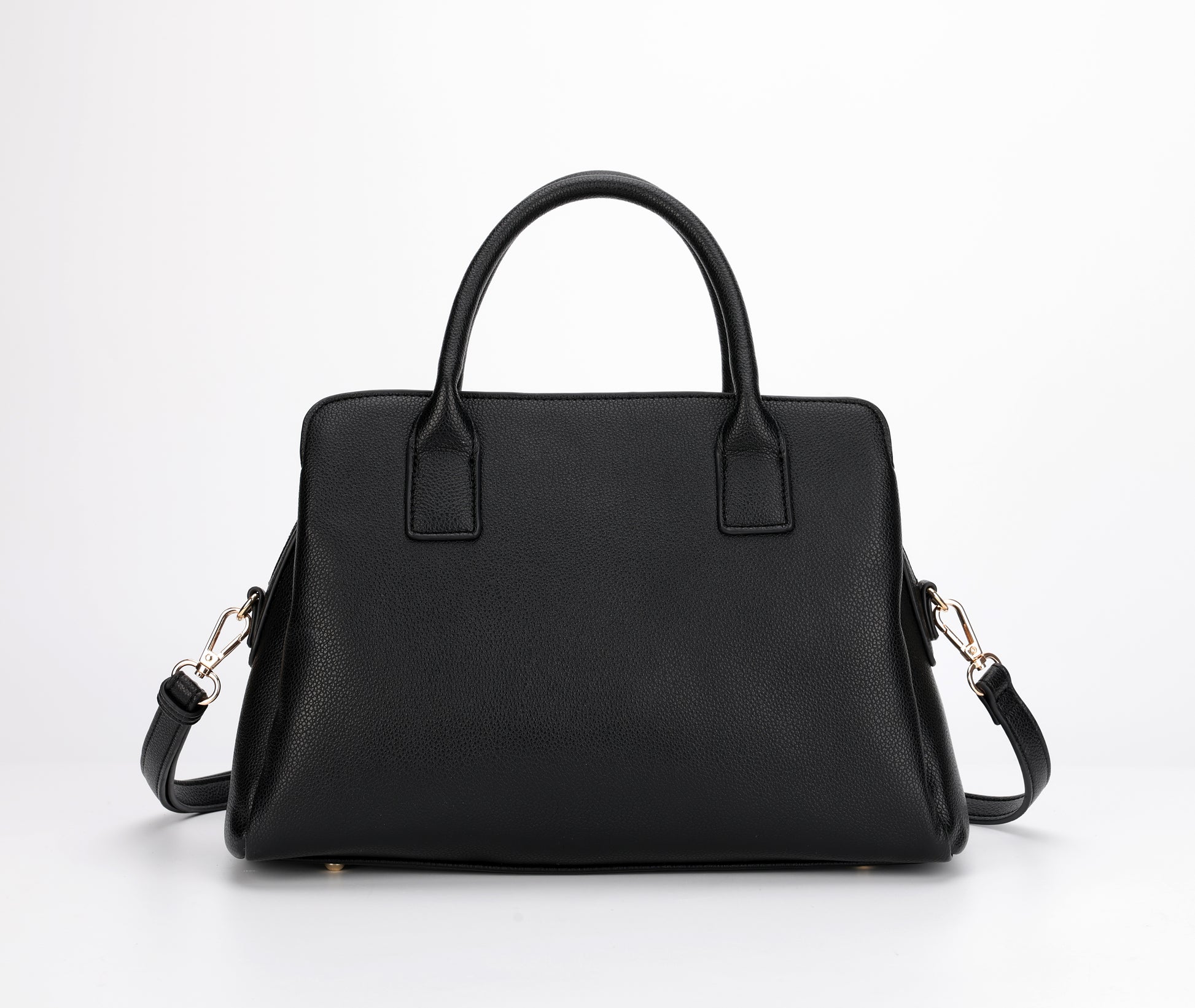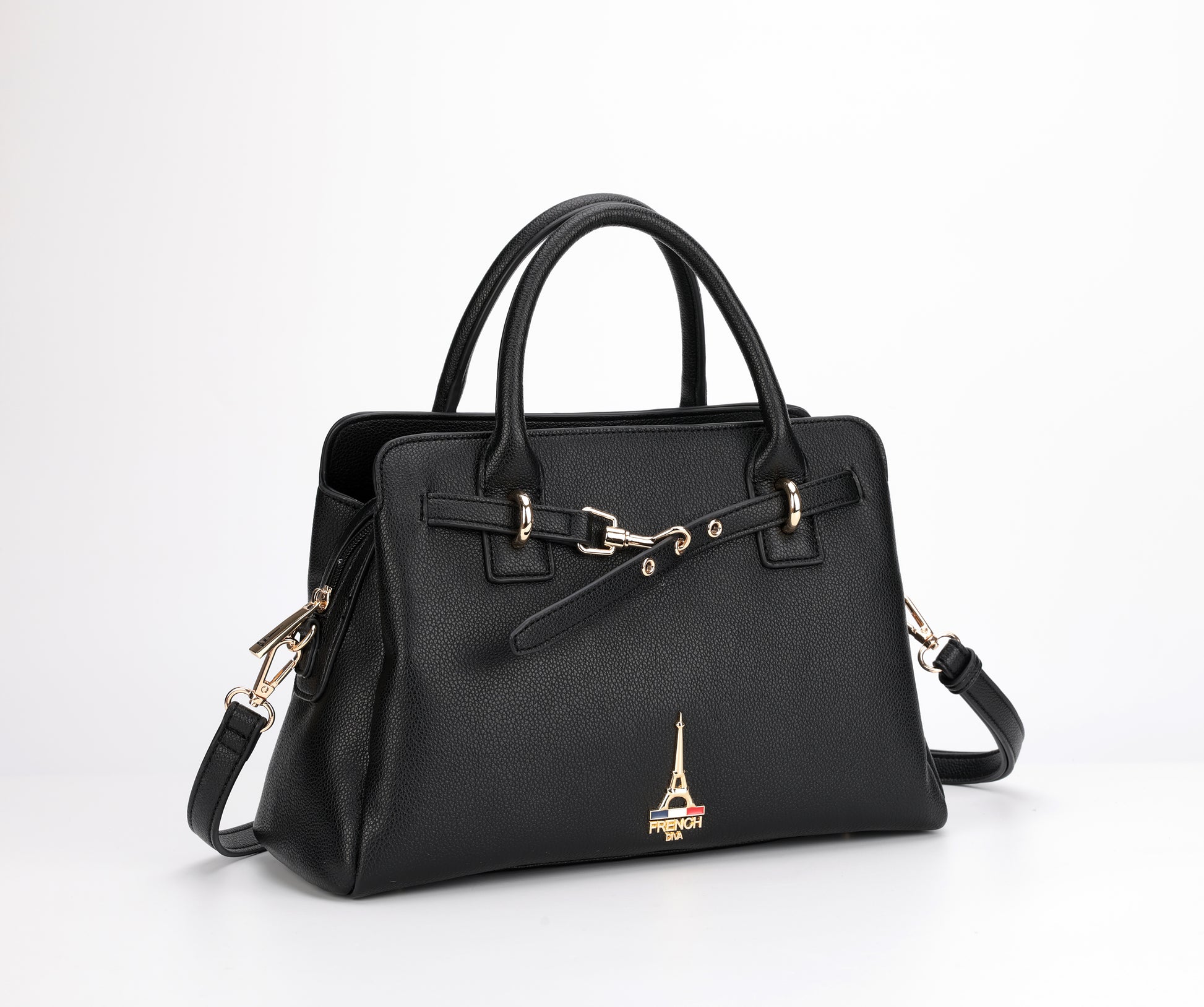 Celia, in Malta, comes from the Latin word for heaven, a name that reflects light and grace. This sleek black structured satchel with gold accents, dual handles and a detachable strap is crafted to bring elegance into every moment.