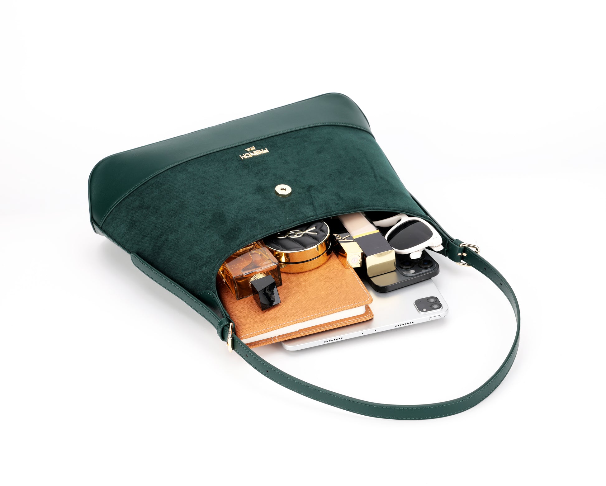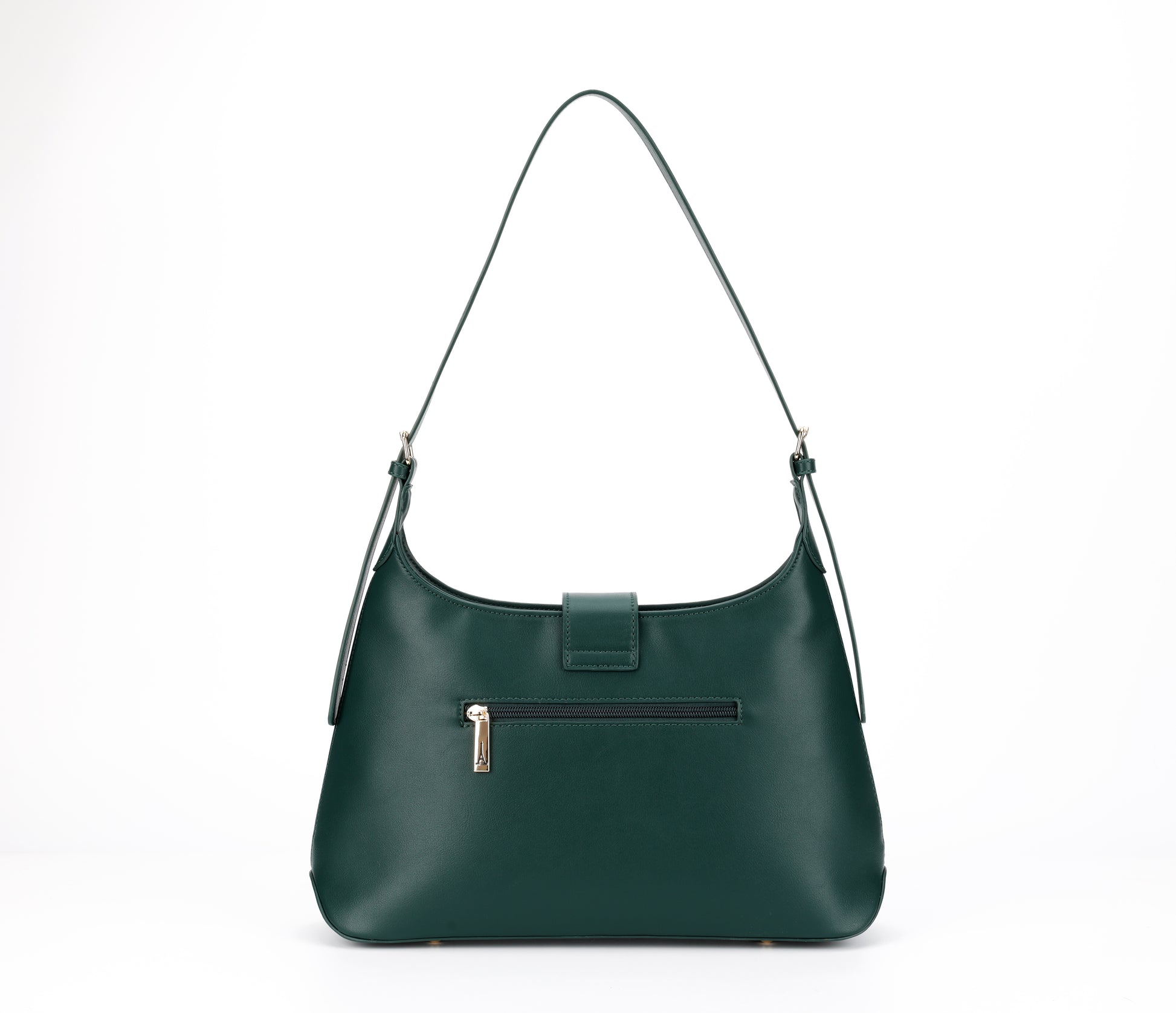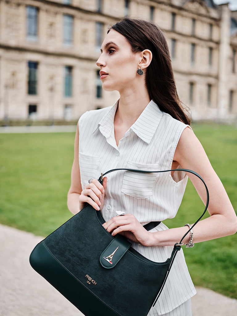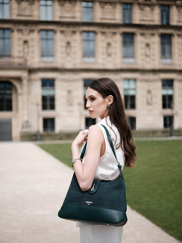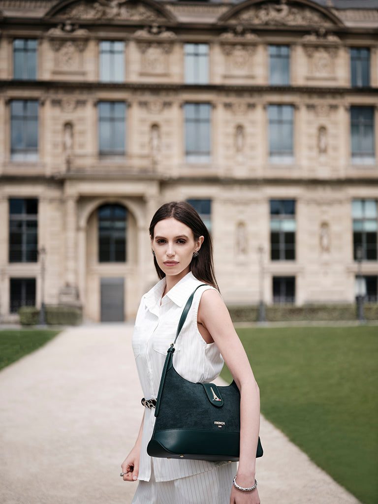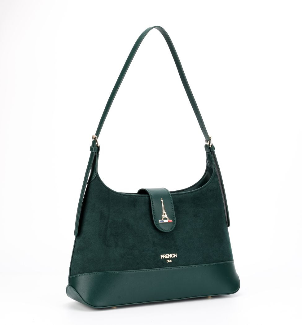 Emerald, inspired by Ireland’s name as the Emerald Isle, symbolizes richness and allure. This deep green shoulder bag with a curved silhouette, flap closure and gold accents brings refined style to every occasion.