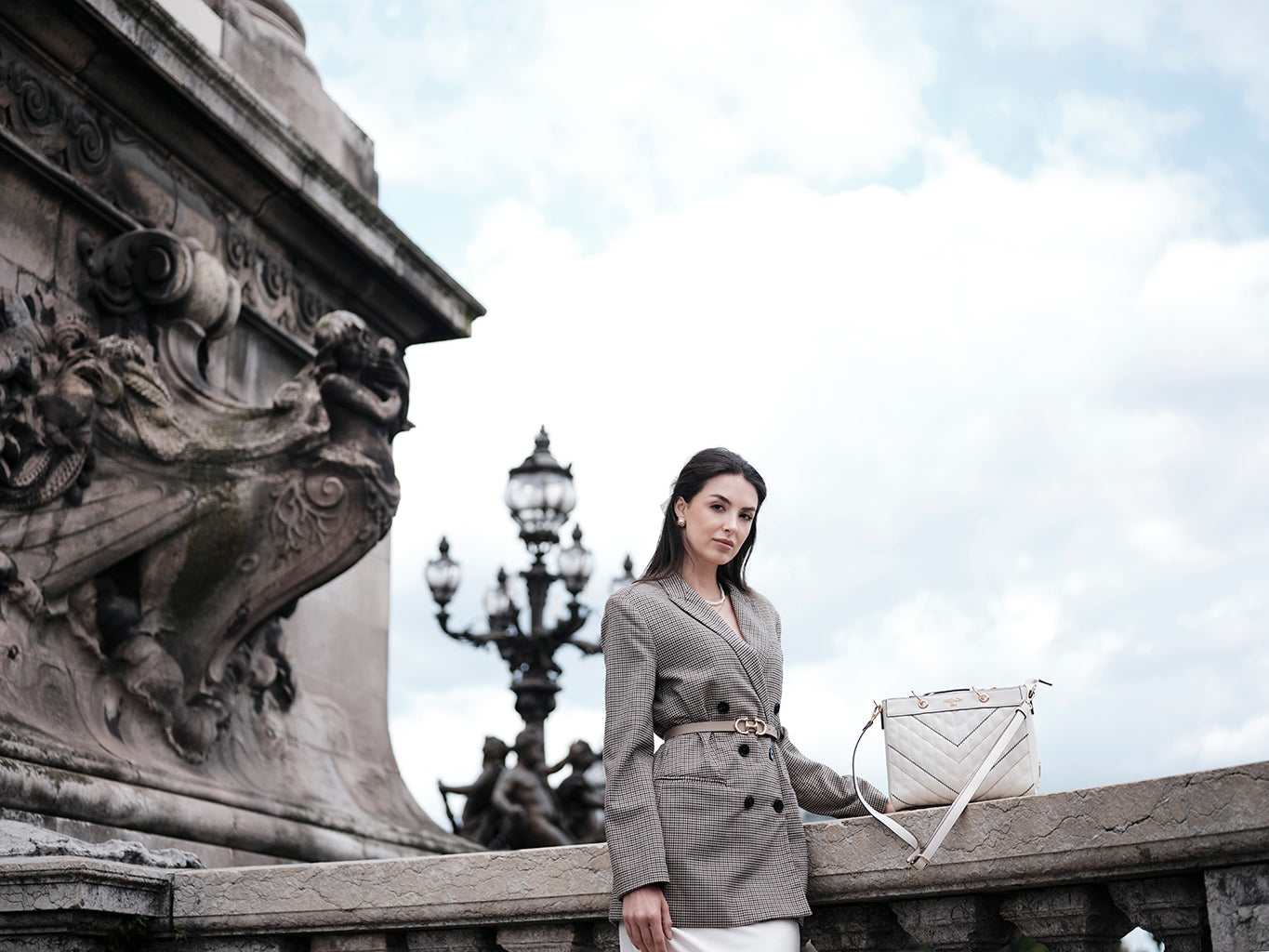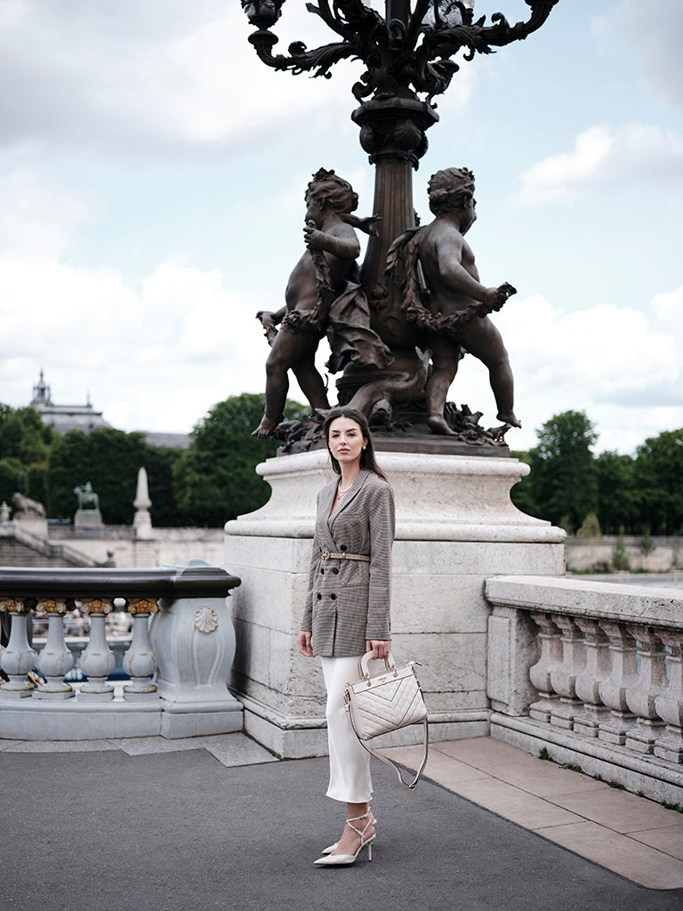 Gracia, inspired by the Swiss word for grace, is a celebration of elegance in its purest form. Crafted in refined beige with a structured quilted silhouette, it is detailed with chevron and diagonal stitching that adds quiet sophistication. Short top handles, polished gold hardware, and a detachable strap bring everyday versatility, making it a timeless expression of grace designed for modern life.