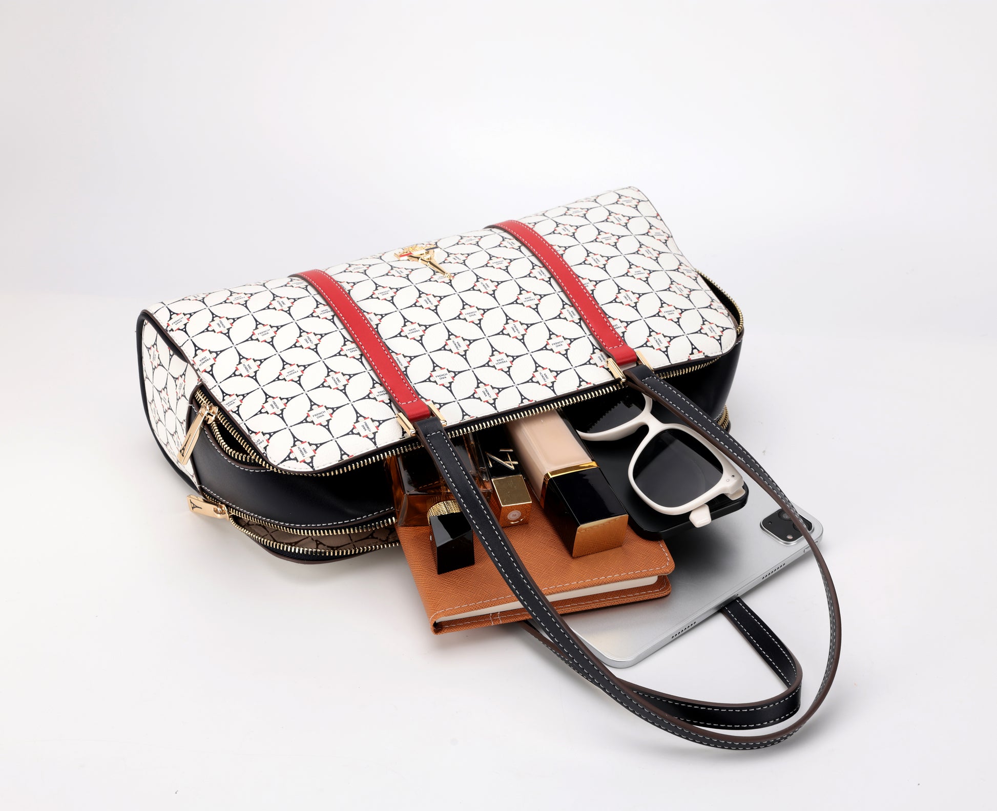 Lyssa, named after the Greek spirit of strength and passion, is crafted for women who command attention with quiet confidence. Its sleek silhouette, bold patterned detailing, and polished gold accents mirror the fiery elegance behind its name. Designed with dual handles, it carries both versatility and power, a modern expression of beauty and resilience.