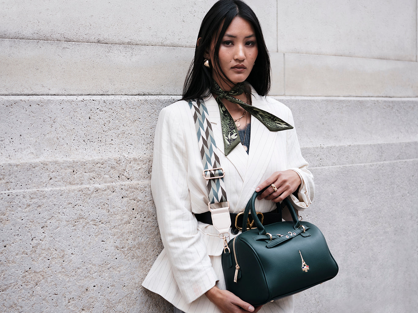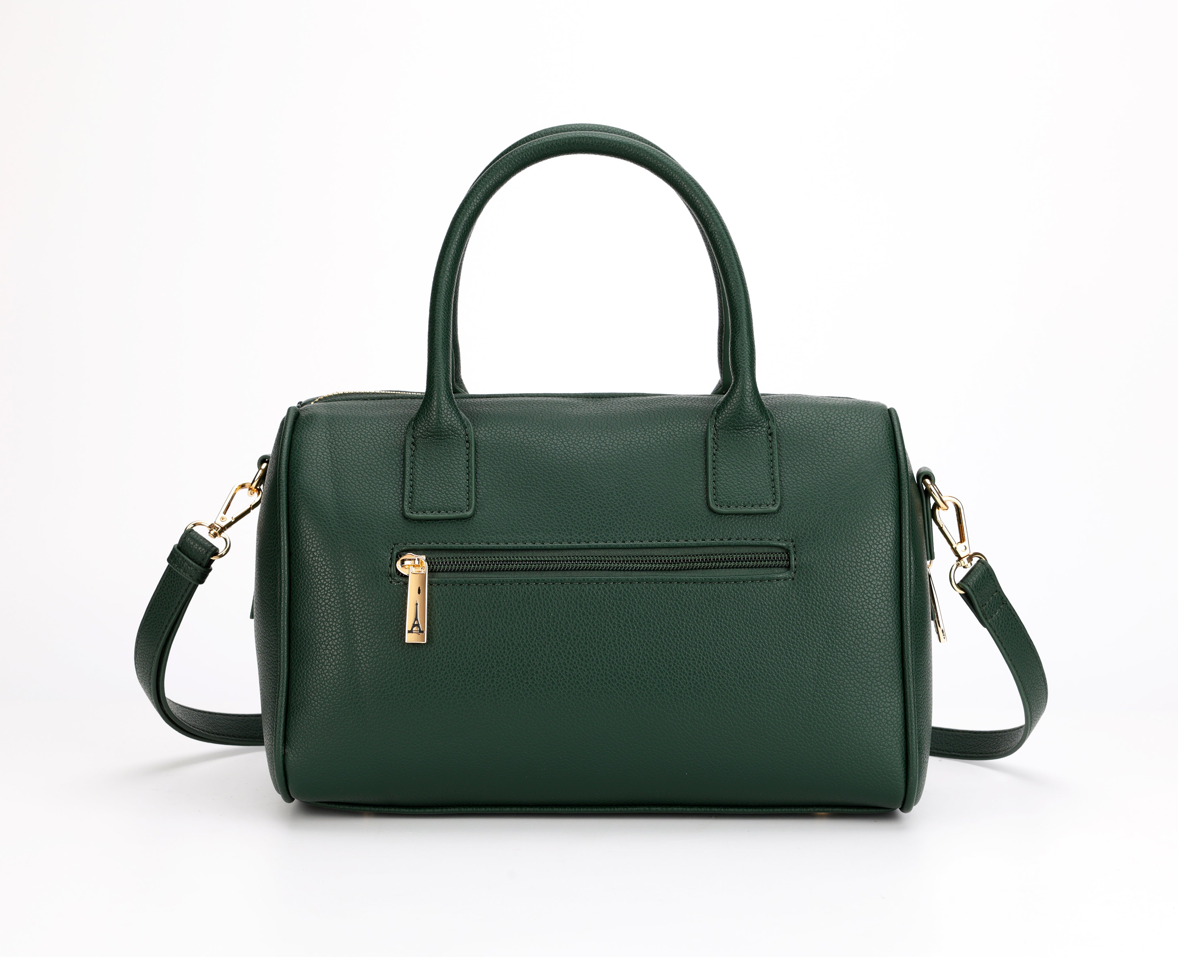 Elena, a name of grace and light, reflects beauty shaped with strength and poise. Inspired by the charm of Moldova, this deep green structured bowler bag features dual handles, polished gold accents and a detachable patterned strap for shoulder or crossbody wear. A versatile design made to carry confidence with ease.