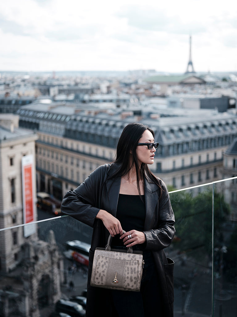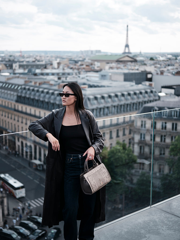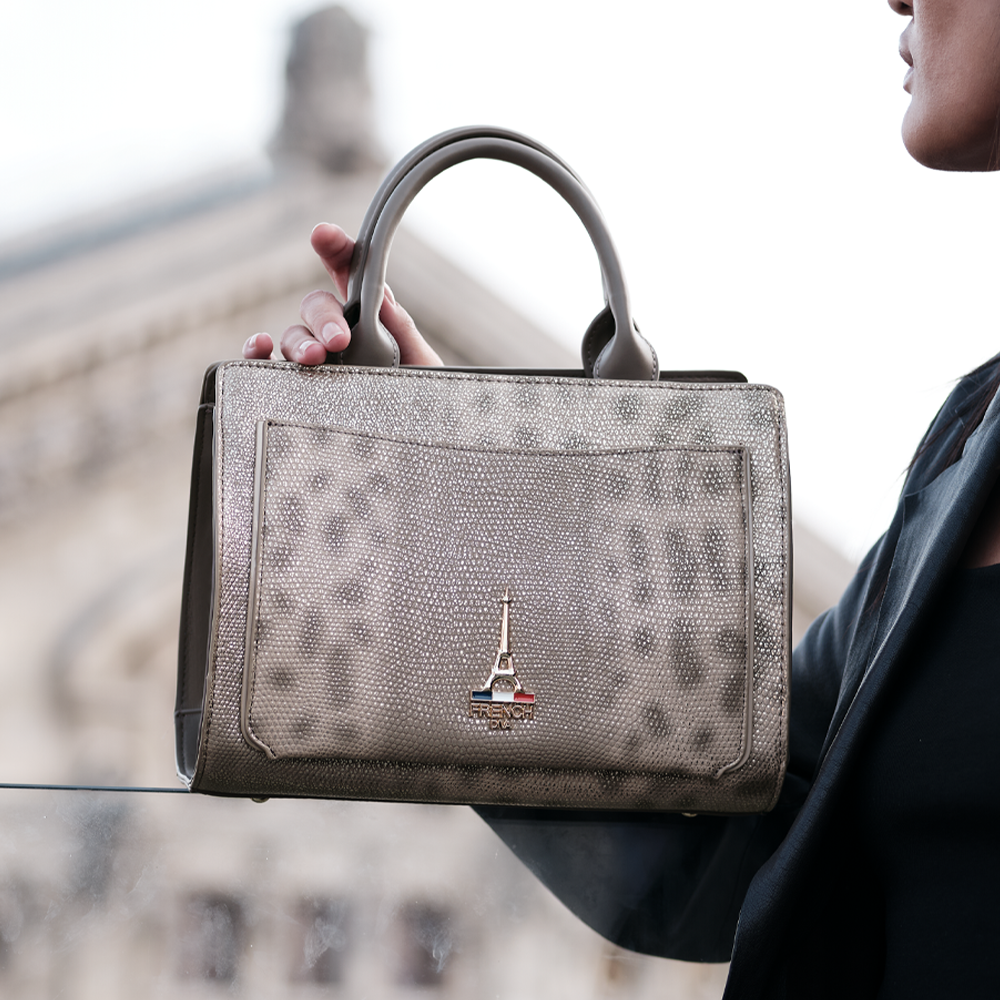 Natia, meaning hope in Georgia, is a statement of strength wrapped in style. Its structured form, refined detailing, and modern print make it a piece that feels both confident and chic.