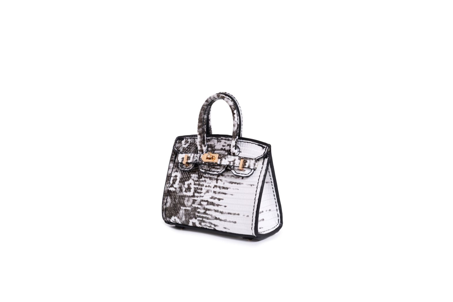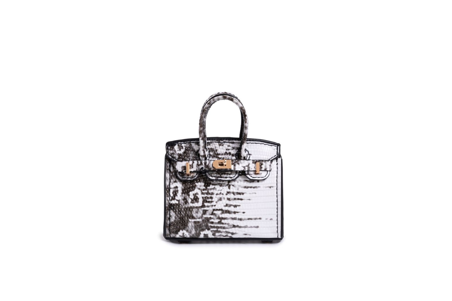 The Python Mini Icon adds striking sophistication to your bag. Designed in a black-and-white snakeskin finish with a structured silhouette and gold hardware, it enhances your handbag with timeless texture and refined allure.