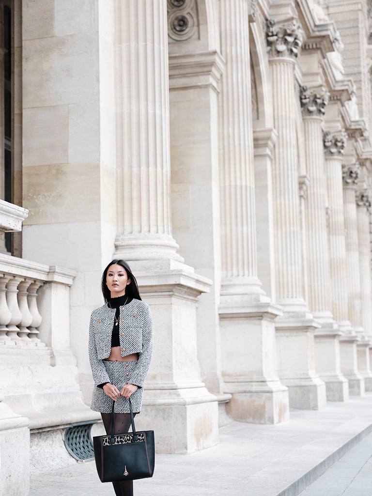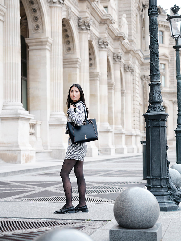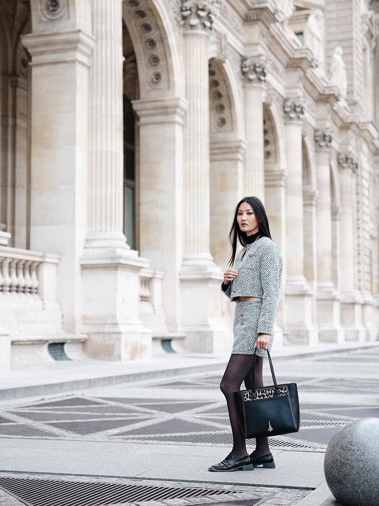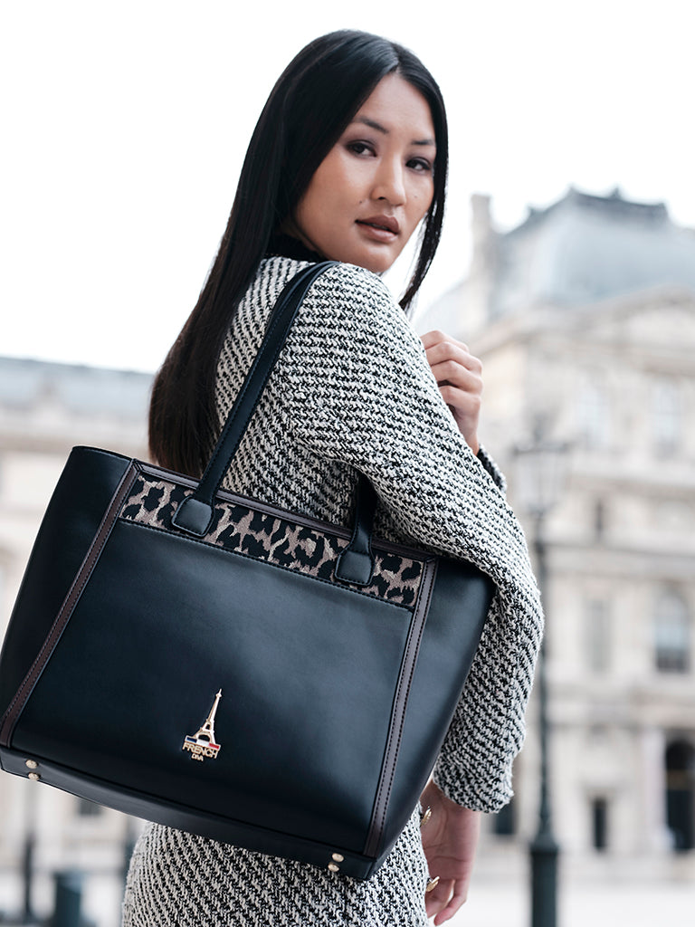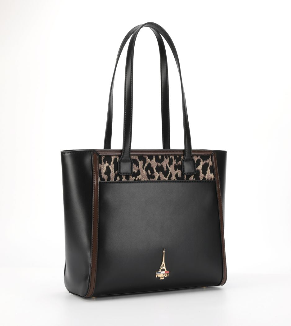 Reka, rooted in the Hungarian meaning of strength, reimagines the structured tote as a symbol of quiet power. Black leather, warm brown trims, and a playful animal-print panel create a piece that feels both bold and refined.