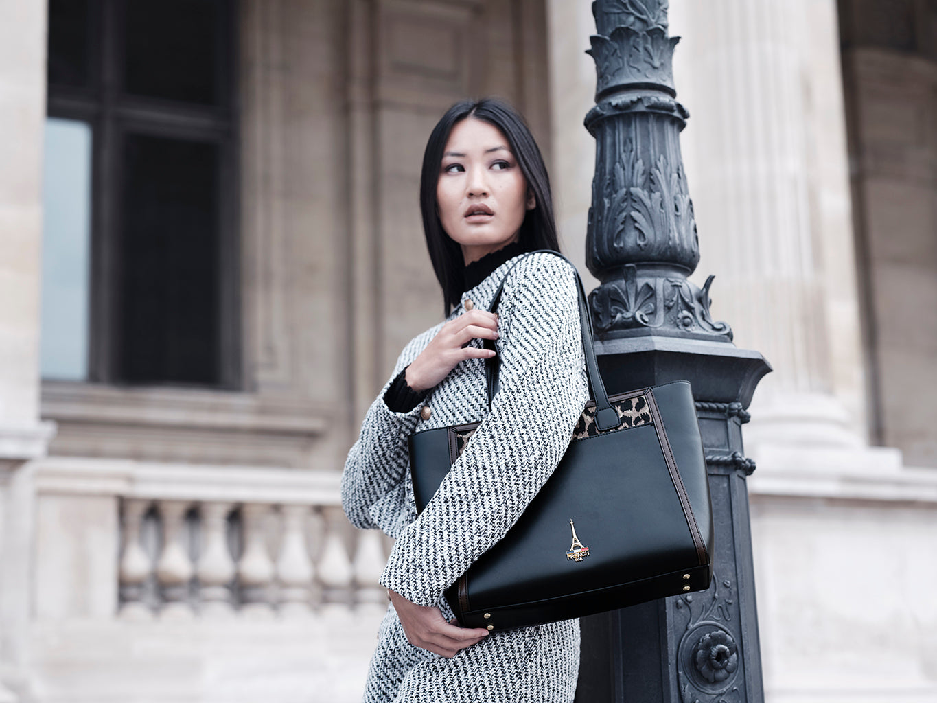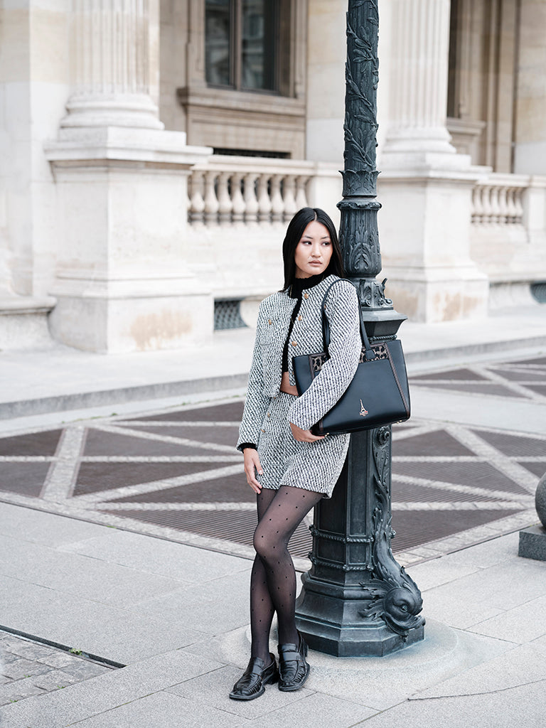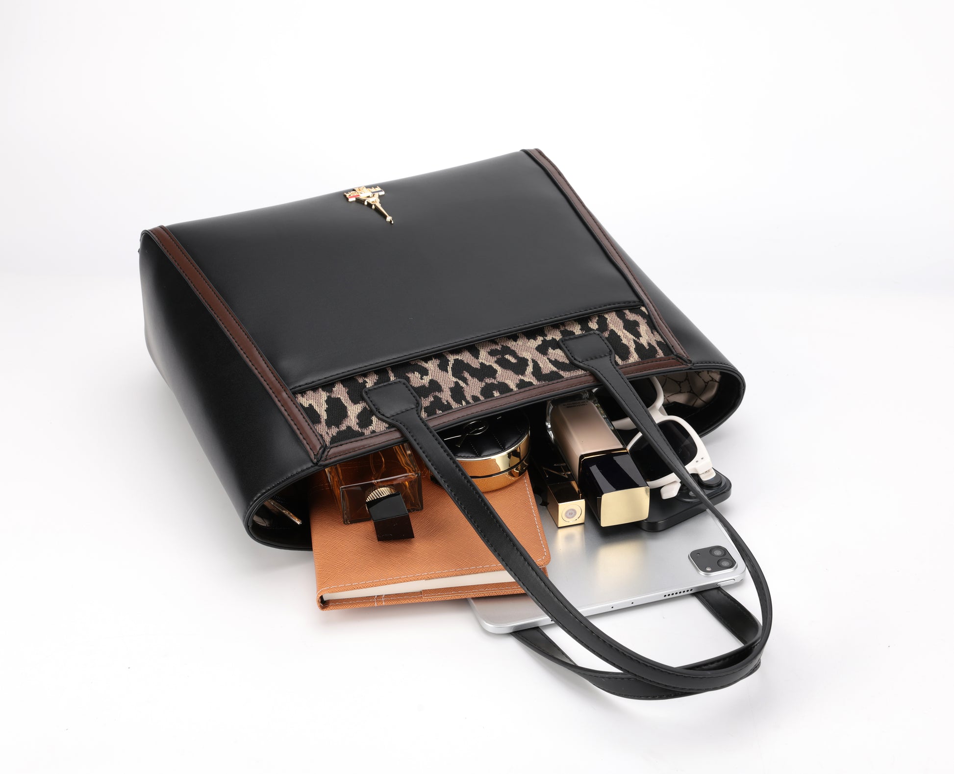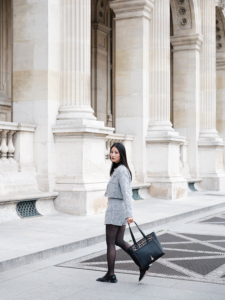 Reka, rooted in the Hungarian meaning of strength, reimagines the structured tote as a symbol of quiet power. Black leather, warm brown trims, and a playful animal-print panel create a piece that feels both bold and refined.