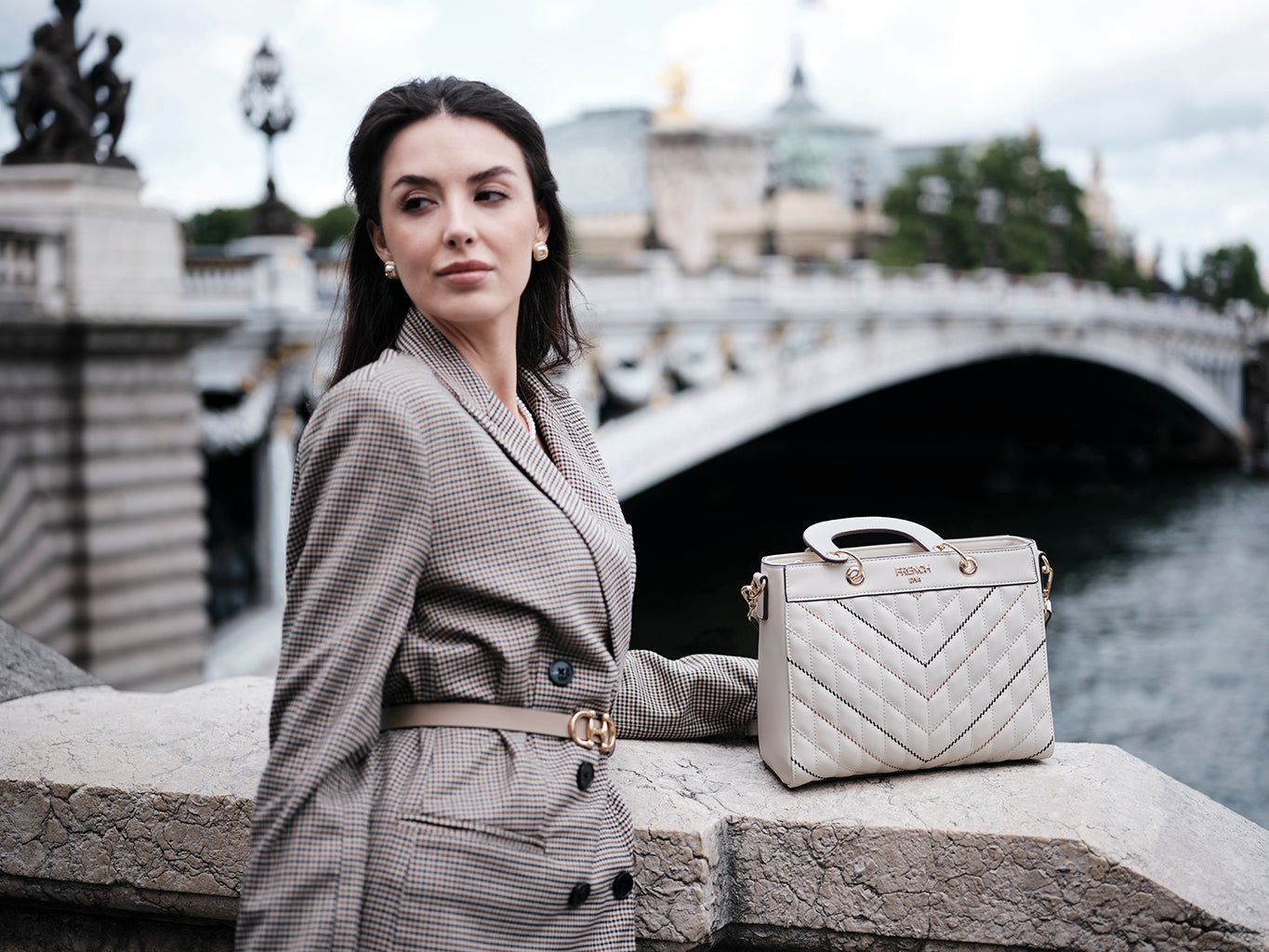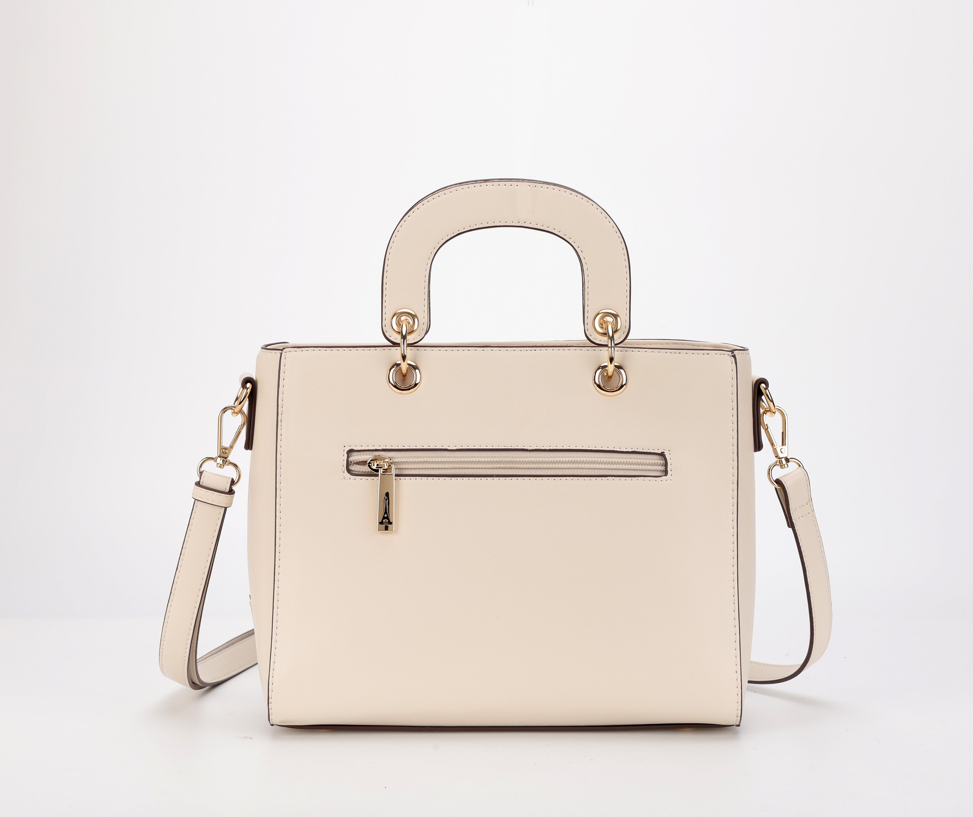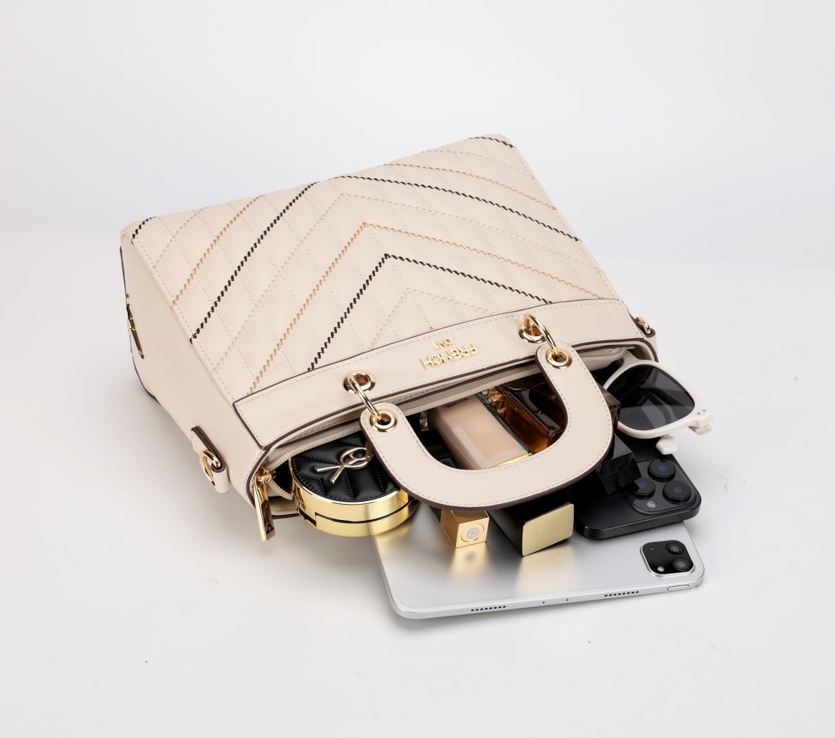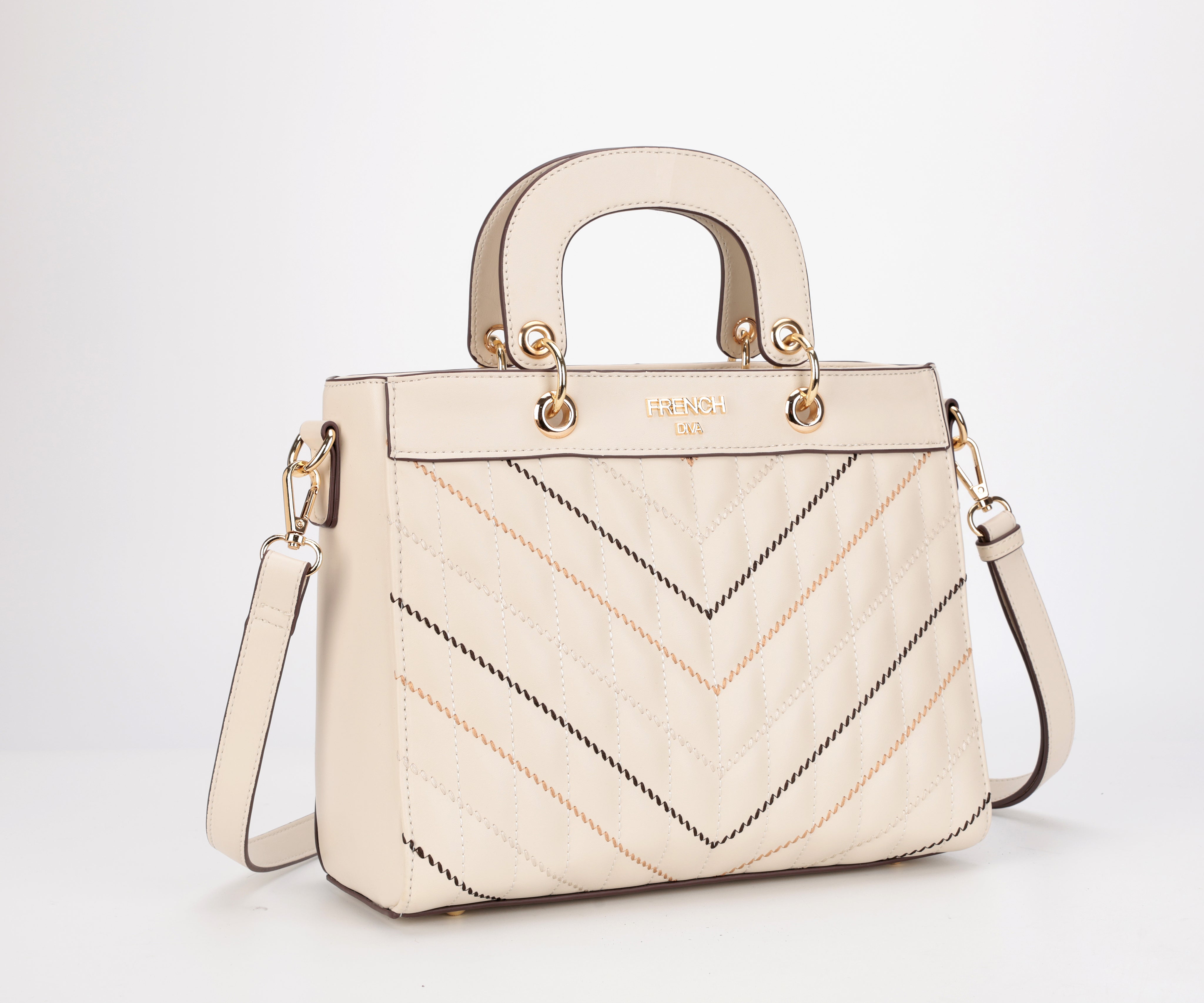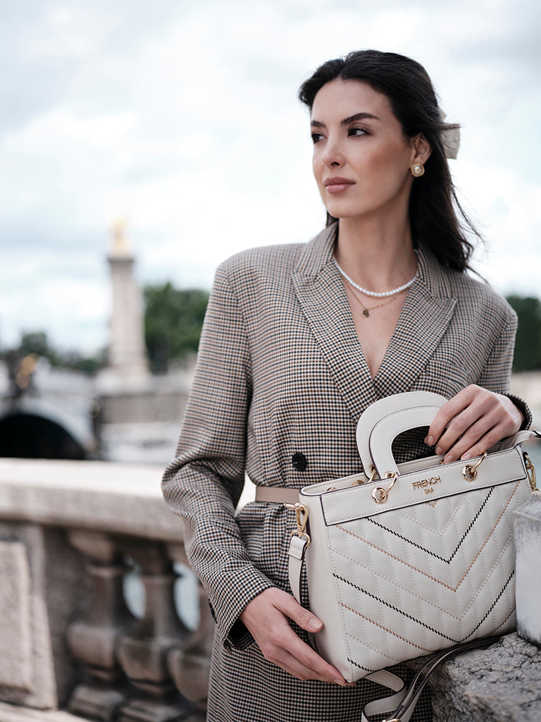 Gracia, inspired by the Swiss word for grace, is a celebration of elegance in its purest form. Crafted in refined beige with a structured quilted silhouette, it is detailed with chevron and diagonal stitching that adds quiet sophistication. Short top handles, polished gold hardware, and a detachable strap bring everyday versatility, making it a timeless expression of grace designed for modern life.